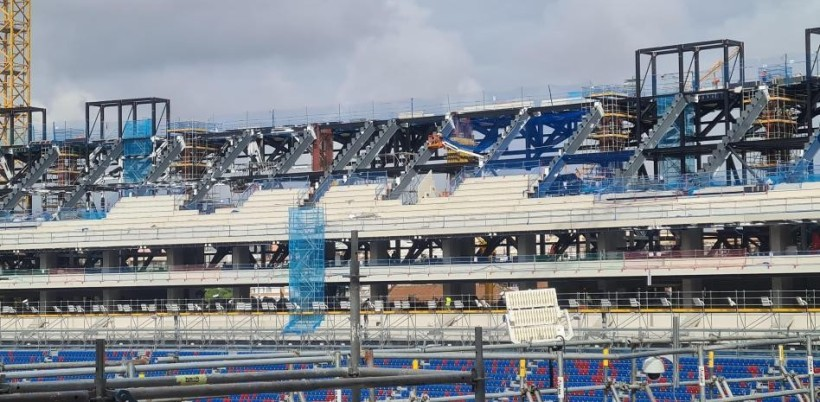 وذكرت الصحيفة أن الأساسات في الجزء السفلي من المدرج قد تم الانتهاء منها، وهي القاعدة التي ستُثبت عليها المقاعد في المستقبل، كما اكتملت بعض الكتل الإنشائية التي وصلت إلى أعلى نقطة في المدرج، بحيث لم يتبق سوى القبة التي ستغطي الملعب.